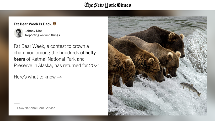 - “Fat Bear Week” – Annenberg Foundation Trustee Charles Annenberg Weingarten and his explore.org initiative brought international attention to the hibernation process of bears through explore.org’s live bear cams, which allowed viewers to participate in “Fat Bear Week.” This annual tournament celebrates the bears’ ability in Alaska’s Katmai National Park to fatten up for hibernation during the brutal winter. A special New York Times interactive piece guided readers through the history of the contest and live bear-cam video.
